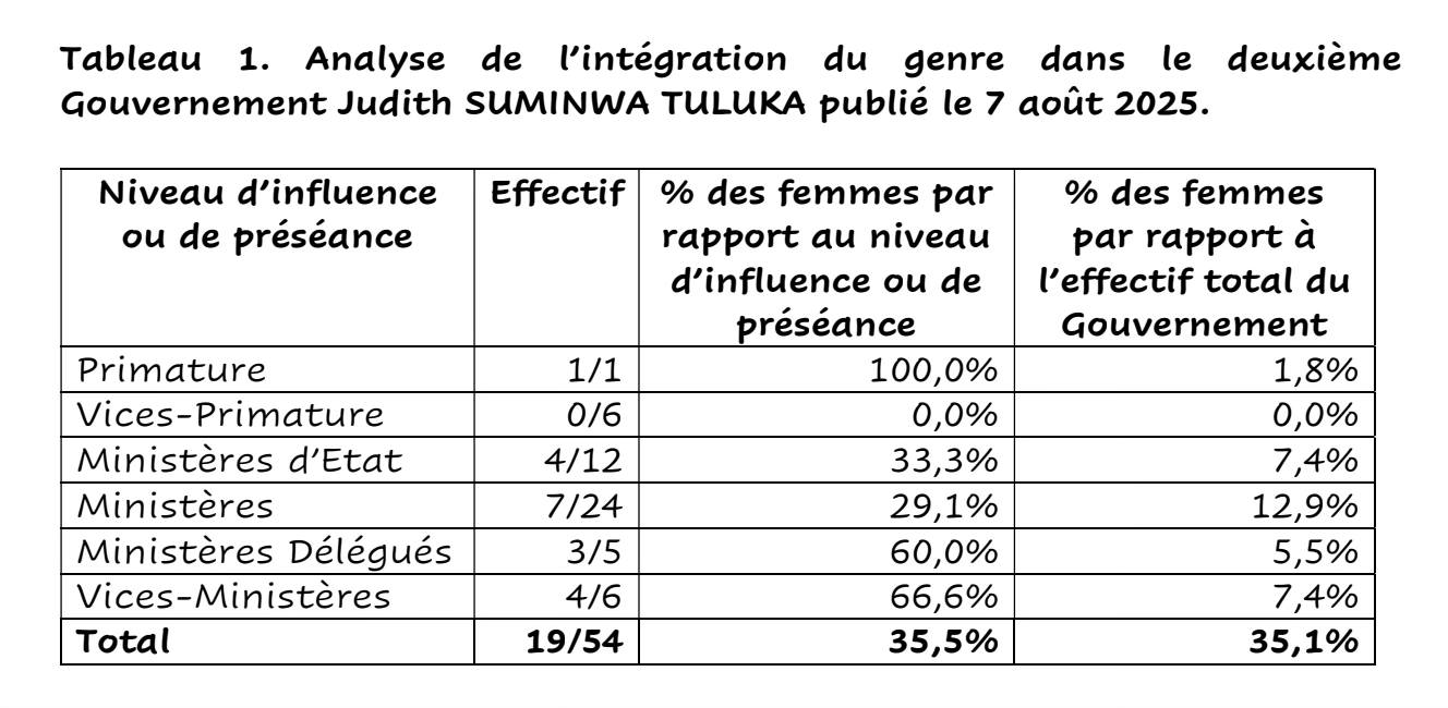Avec la publication de l’Ordonnance n°25/247 du 7 août 2025 par la Porte-parole du Chef de l’Etat, Madame Tina SALAMA, la République Démocratique du Congo vient d’être dotée d’un nouveau Gouvernement, le deuxième de la Première Ministre Judith SUMINWA TULUKA. Fidèle à sa mission de promotion des droits Humains, ACADHOSHA asbl vient de faire, à travers son Feuillet ISSANDA, une analyse de l’intégration du genre dans ce Gouvernement, et ceci à un double niveau:
